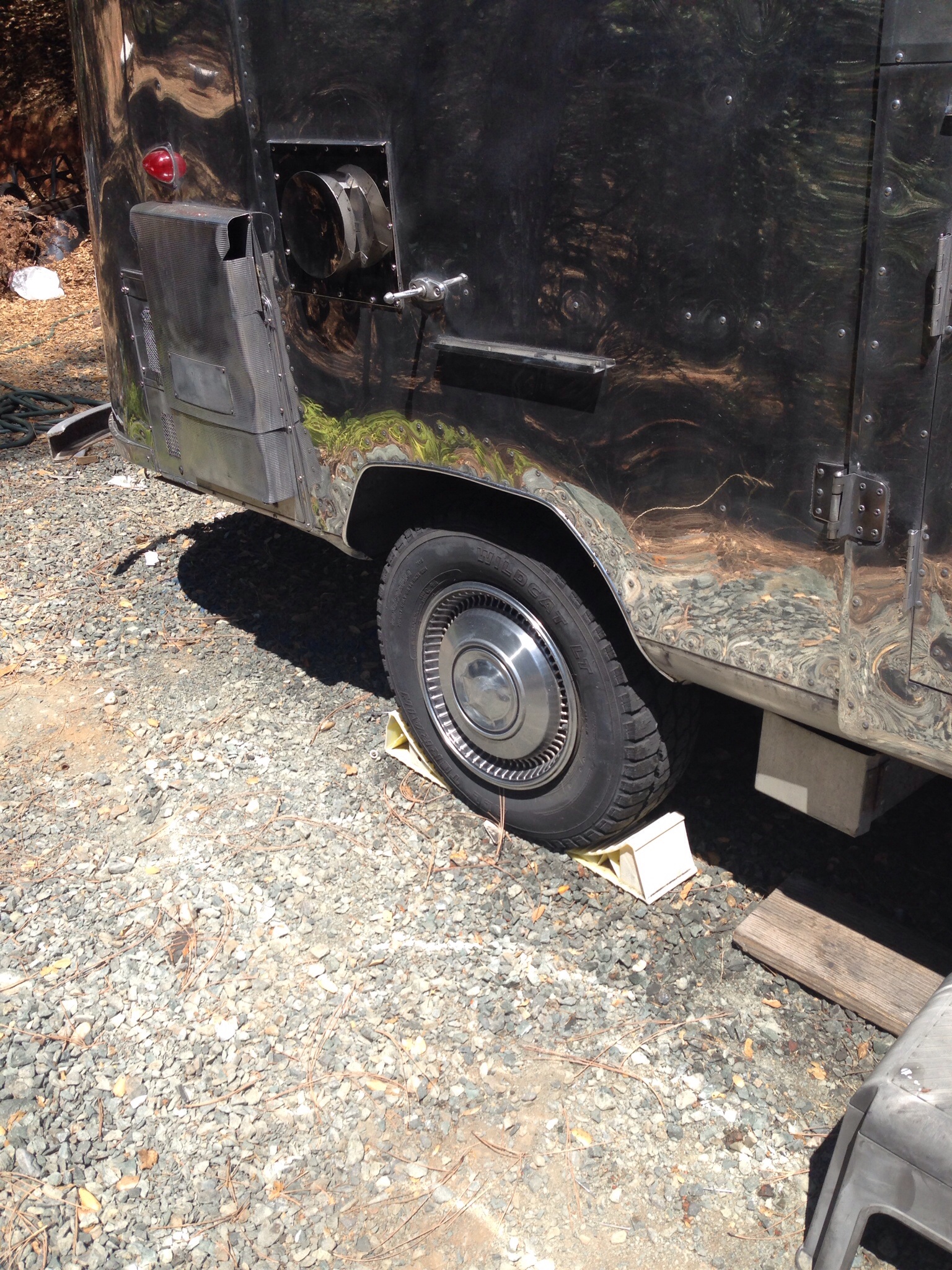 Nothing says vintage on a car or trailer like moon hub caps. My wheels won’t take moon hub caps, so I got these “smoothies”for the trailer. They match pretty well!