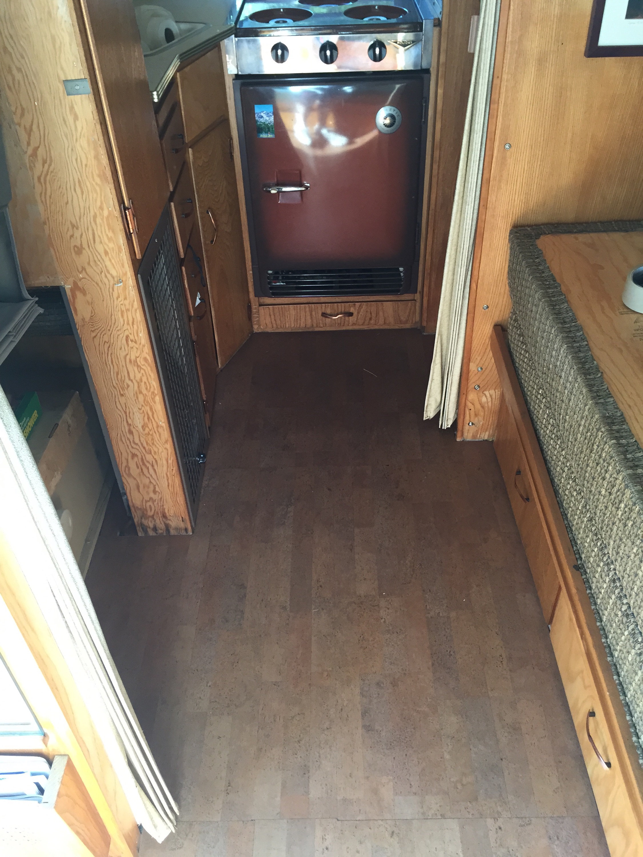 As part of the improvements to the trailer, I installed a cork floor. I never really liked it. While exploring options on airforums.com, I read about someone who installed carpet over the current floor. If it got dirty, they just took it out and cleaned it. The Bambi is so small (the interior floor is only 9′ long) that it was easy. I think it came out great!